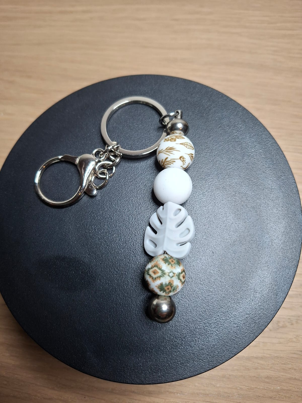 Dieser handgefertigte Schlüsselanhänger mit Monstera-Blatt kombiniert moderne Natur-Elemente mit harmonisch abgestimmten Perlen in Weiß-, Gold- und Naturtönen. Perfekt für alle, die einen dezenten, aber besonderen Blickfang suchen.